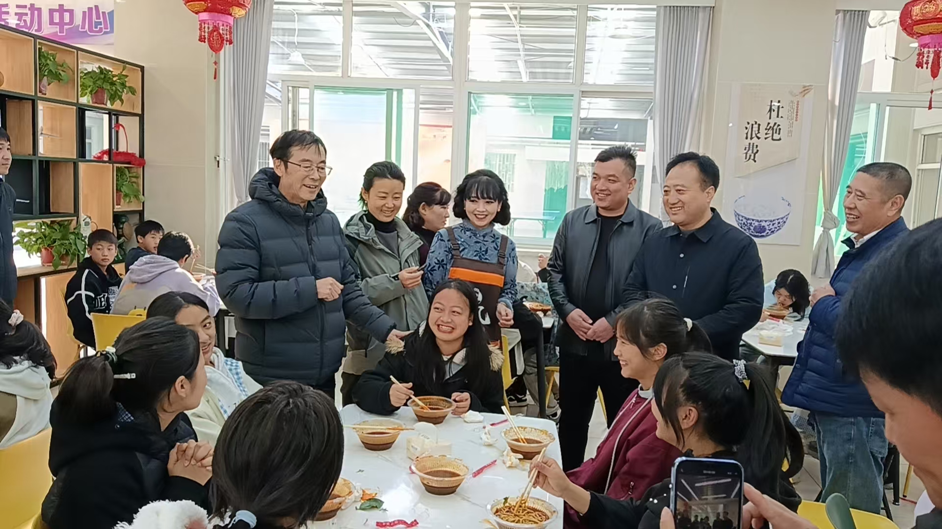 此次爱心活动还特别增添了一份暖意。山西十凤老白家餐饮管理服务有限公司董事长白十凤为了让孩子们尝到最新鲜、地道的味道,特意带上厨师团队,现场制作热气腾腾的十凤牛肉丸子面。羊肉饺子馅也由她亲手调配。大家以“爸爸妈妈”的身份与孩子们亲切互动,一起包饺子——有人擀皮,有人包馅,有人端盘,有人记录……各尽所能,有说有笑,场面温馨而热闹。饭桌上,除了羊肉饺子,白十凤牛肉丸子面、还有山西老关家食品开发有限公司董事长关志丰亲自送来了三合成辣椒酱,孩子吃的又香又开心,个个脸上洋溢着幸福的笑容,在浓浓的关爱中感受到了真挚的归属感。这顿团圆饭,因爱与心意而显得格外丰盛。